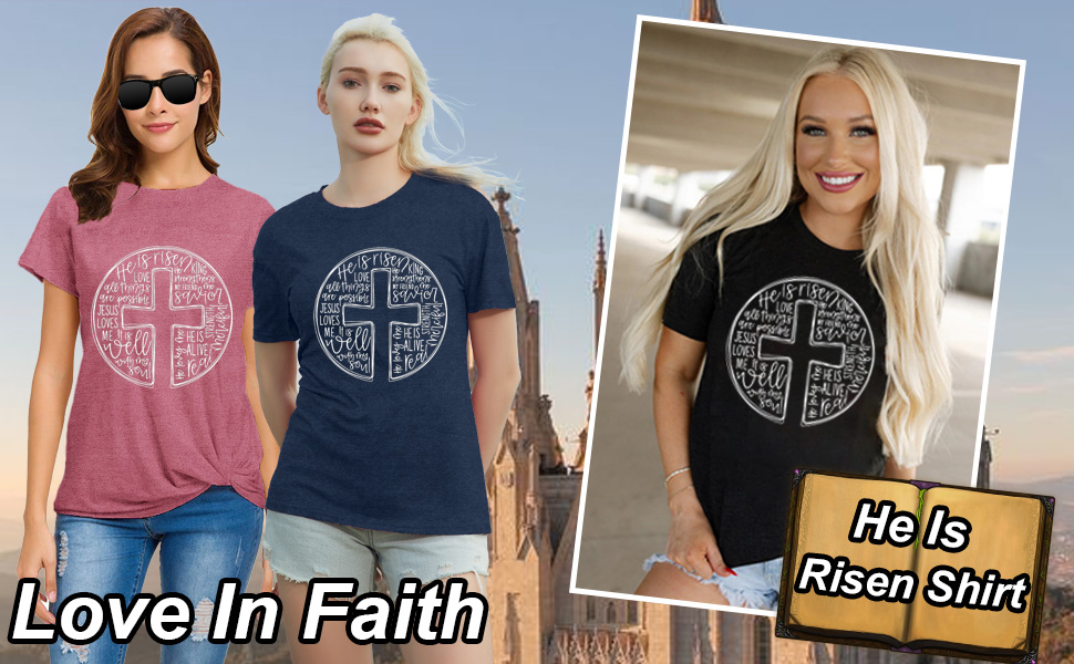 - ✝️FASHION DESIGN:Christian cross prints and phrases such as “He Is Risen” are stacked to create a vintage yet stylish look that shows devotion to Jesus when worn.